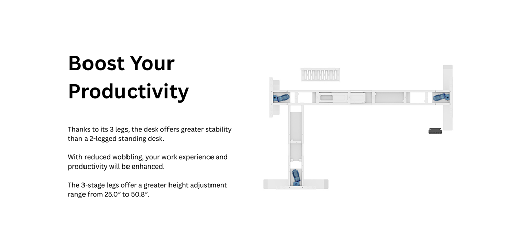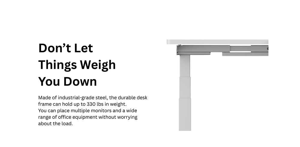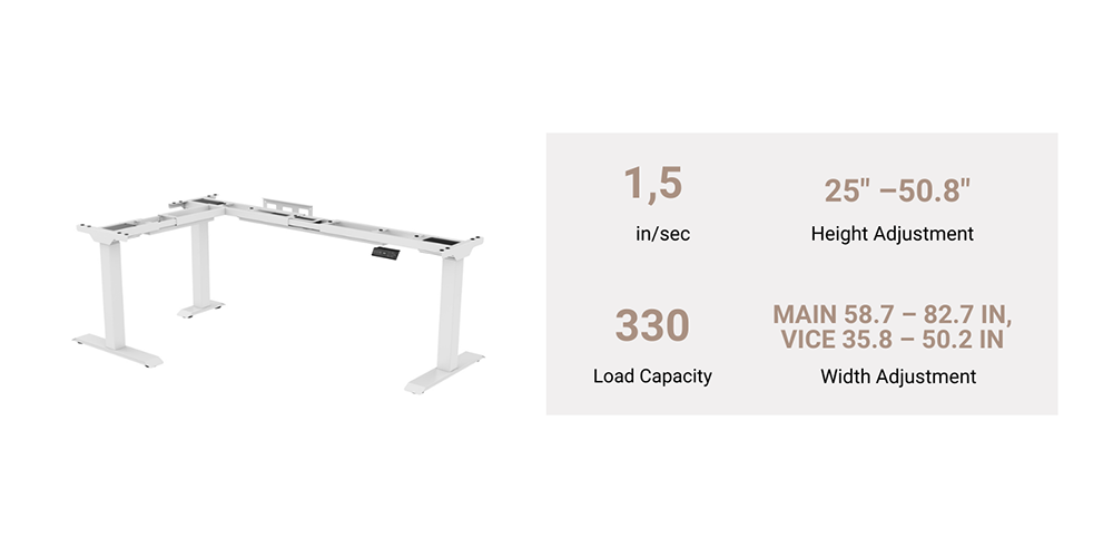 Thanks to its 3 legs, this adjustable height desk offers greater stability than a 2-legged standing desk. With reduced wobbling, your work experience and productivity will be enhanced. The 3-stage legs offer a greater height adjustment range from 25" to 50.8". The wide, L-shaped desktop lets you make the most of your workspace. You can switch the positions of the reversible panels, which makes this standing desk convenient for both left-handers and right-handers. Made of industrial-grade steel, the durable desk frame can hold up to 330 lbs. in weight. You can place multiple monitors and a wide range of office equipment without worrying about the load.