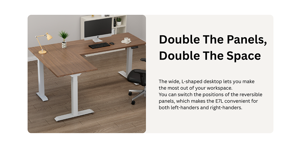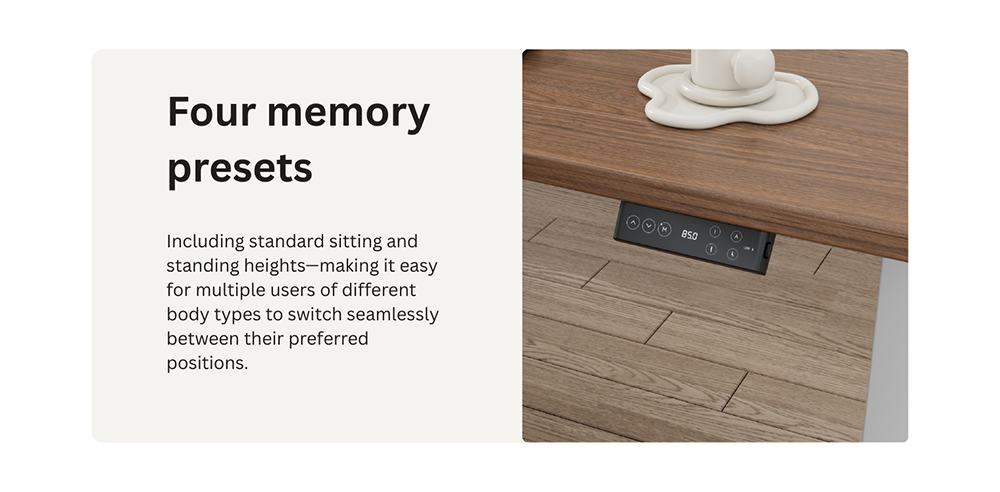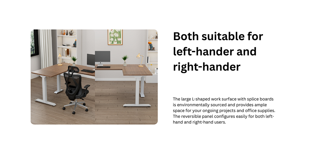 The large L-shaped work surface is environmentally sourced and provides ample space for your ongoing projects and office supplies. The reversible panel configures easily for both left-handed and right=handed users. The adjustable height desks control panel includes 4 memory presets and sitting and standing heights, making it easy for multiple users or different body types to switch seamlessly between their preferred positions.